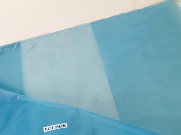 VCI氣相防銹膜(防銹袋)是將高分子聚乙烯樹脂(LDPE)與功能VCI樹脂配比混合,采用現代薄膜共擠技術生產的新一代復合防銹薄膜。具有良好的氣化防銹性能、阻隔防潮、使用方便、透明直觀等特點;當用塑料袋包裹金屬產品時,氣相緩蝕劑在封閉空間內氣化并凝聚在所有金屬表面上形成氣相保護層,從而防止金屬產品銹蝕。符合GB-T19532-2004防銹性能要求。